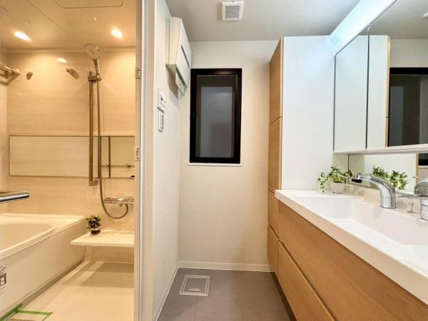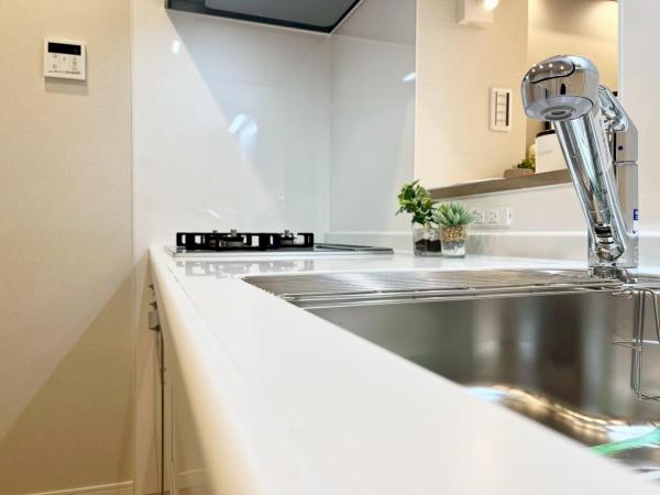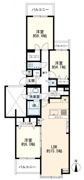 - 追焚機能,浴室乾燥機,システムキッチン,カウンターキッチン,ウォークインクローゼット,室内洗濯機置場,エレベーター,エアコン,オートロック,二面バルコニー