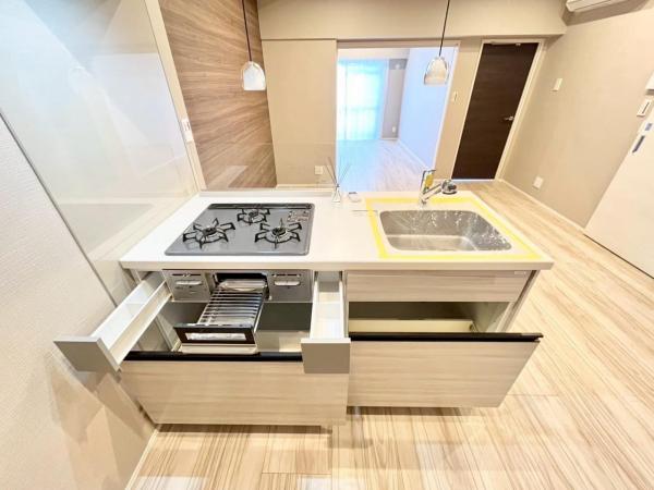 - 追焚機能,浴室乾燥機,システムキッチン,ウォークインクローゼット,トランクルーム,給湯,室内洗濯機置場,照明器具,宅配BOX,エアコン
