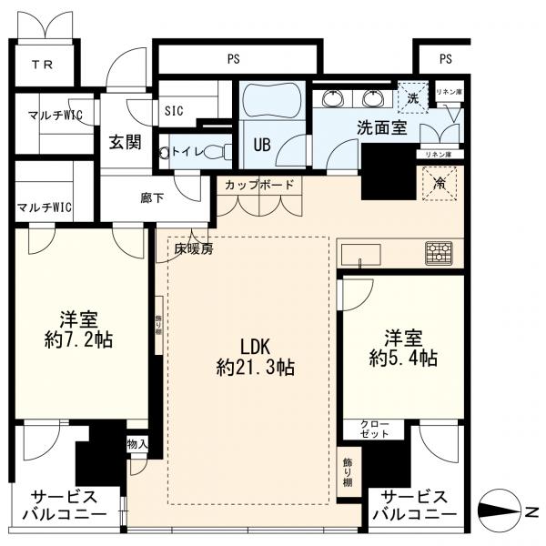 - 追焚機能,浴室乾燥機,システムキッチン,ディスポーザー,ウォークインクローゼット,トランクルーム,エレベーター,照明器具,宅配BOX,エアコン,床暖房,オートロック,二面バルコニー