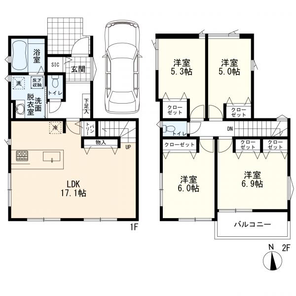 閑静な住宅地、市街地が近い、整形地、2沿線以上利用可、LDK17帖以上、対面式キッチン、システムキッチン、食器洗乾燥機、浄水器、浴室に窓、浴室暖房、浴室乾燥機、追焚き給湯、トイレ2ヶ所、温水洗浄便座、独立洗面台、シャワー付き洗面化粧台、全居室収納スペース、パントリー、床下収納、シューズクローク、南面バルコニー、全居室2面採光、全居室フローリング、Low-Eガラス、TVインターホン、24時間換気システム、スーパー徒歩10分以内、小学校徒歩10分以内、総合病院徒歩10分以内、都市ガス、2階建、年内入居可