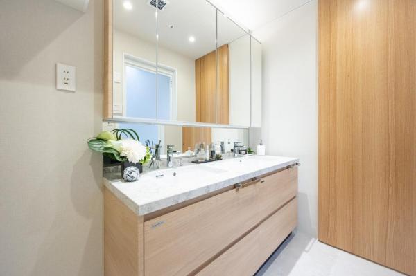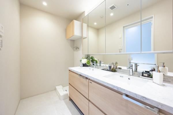 その他画像:三面鏡付き洗面化粧台は、3つの鏡の角度を調整することで、より広い範囲の身だしなみを確認できます。鏡裏の収納スペースが多く、歯磨き、ヘアセット、メイクといった身支度を一か所で完結させることが出来ます。