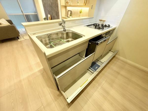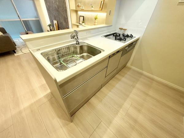 キッチン:食洗器・3口ガスコンロが搭載されたシステムキッチン。ブレンダー等の調理器具の使用時に便利な手元コンセントも備わった機能的なキッチン。