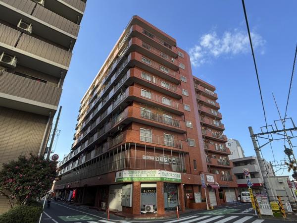 外観:角地に位置する、地上9階建てのマンション。