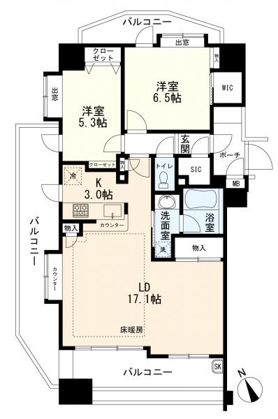 - オール電化,浴室乾燥機,カウンターキッチン,ウォークインクローゼット,給湯,室内洗濯機置場,エレベーター,床暖房,二面バルコニー,バイク置き場,駐輪場