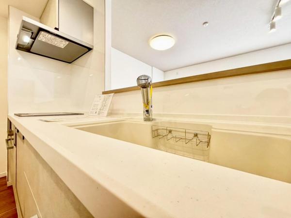 キッチン:ホワイトを基調とした清潔感のあるキッチン。使い勝手の良い設備のキッチンで効率よくお料理ができます。