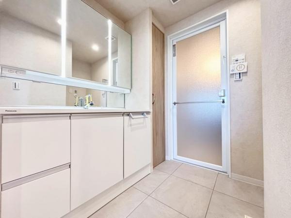 その他画像:洗面室は、しっかりとしたスペースを確保。上質な温かみを持つカラーで統一されています。ワイドな洗面台は収納力もありいつでもすっきりとした洗面室に。