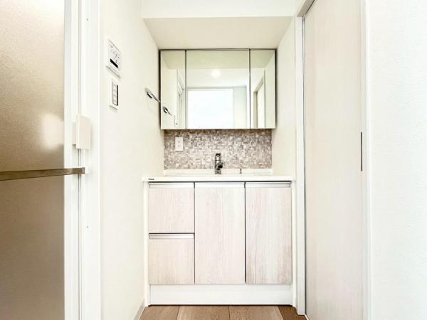 その他画像:三面鏡の裏は機能的な収納を配置。コンセントも付いているため電動シェーバーや、電動歯ブラシも収納できます。