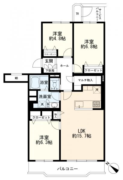 - 追焚機能,浴室乾燥機,システムキッチン,浄水器,トランクルーム,給湯,室内洗濯機置場,照明器具,二面バルコニー