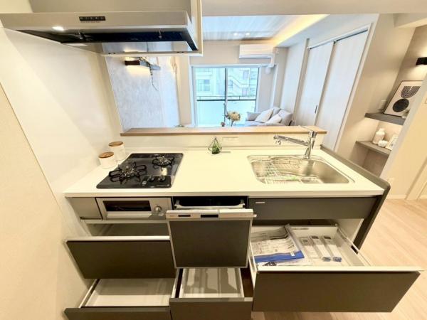 キッチン:引出し収納などにより、収納量がアップしているだけでなく、調理中、取り出しやすい位置に調理器具や食材等を収める細かい工夫がなされています。シンクまわりもすっきりとまとまります。