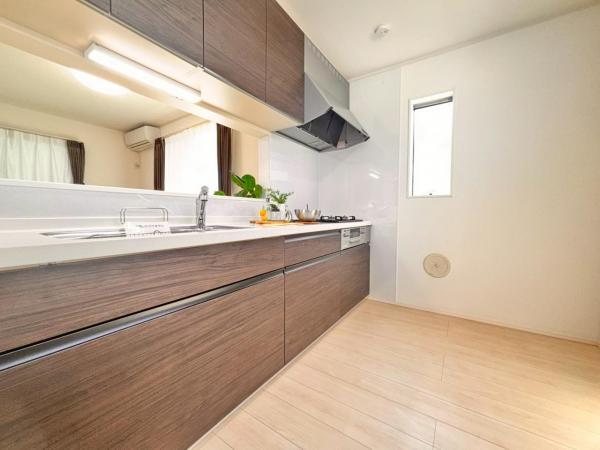 その他画像:対面カウンターキッチン キッチンは、ご家族との会話が楽しめる対面カウンタータイプを採用。リビングで遊ぶお子様の様子をうかがいながらお料理もできます。頭上に棚のないオープンタイプなら開放感もいっぱい。