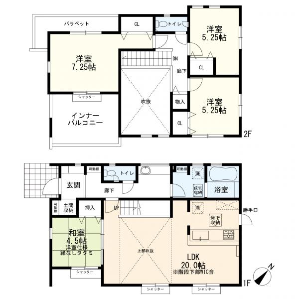 閑静な住宅地、前面道路6m以上、駐車場2台分(車種による)、都市ガス、電気、上水道、下水道、対面式キッチン、カウンターキッチン、浴室に窓、バストイレ別、トイレ2ヶ所、室内洗濯機置場、収納、全居室収納スペース、床下収納、バルコニー、全居室2面採光、フローリング、シャッター雨戸、LDK20帖以上、和室、勝手口、24時間換気システム、吹き抜け、リビングイン階段、2階建