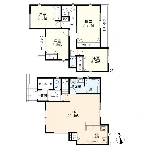 陽当り良好、前面道路6m以上、スーパー徒歩10分以内、小学校徒歩10分以内、駐車場2台分(車種による)、都市ガス、食器洗乾燥機、対面式キッチン、システムキッチン、追焚き給湯、浴室乾燥機、浴室暖房、浴室に窓、トイレ2ヶ所、温水洗浄便座、独立洗面台、全居室収納スペース、床下収納、シューズクローク、バルコニー、全居室2面採光、2面採光、Low-Eガラス、カードキーシステム、TVインターホン、LDK18帖以上、24時間換気システム、リビングイン階段、宅配ボックス、外壁サイディング、シャッター雨戸、2階建