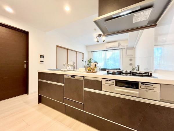 • キッチン:食洗器、3口ガスコンロを搭載した落ち着きのあるシステムキッチン。圧迫感の少ないフラットキッチンで開放感のある空間です。