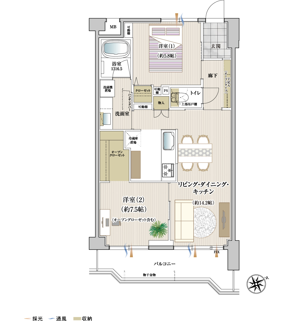 各空間に独立性があり、用途別に使い分けができる2LDK。